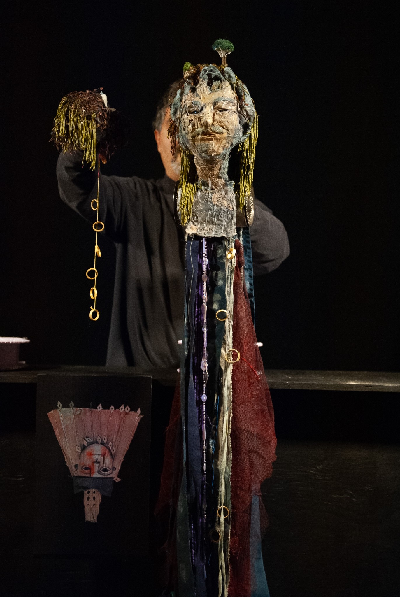 Jaber Lutfi me fait visiter les lieux. Autour d’une scène modulable pouvant accueillir une trentaine de spectateurs et spectatrices, une congrégation de personnages hétéroclites attend patiemment de prendre vie. Tout est à portée de la main pour concevoir les différents types de marionnettes : matériel, outils, éclairage et accessoires de toutes sortes. Avant de plonger dans le vif du sujet, Jaber me relate son parcours en arts visuels, ses études, ses expos, ses collaborations avec le monde du théâtre et sa vie de peintre. Vous pouvez d’ailleurs observer ses fascinantes œuvres ici. Et découvrir pourquoi son travail pictural s’accorde si naturellement avec l’art de la marionnette.