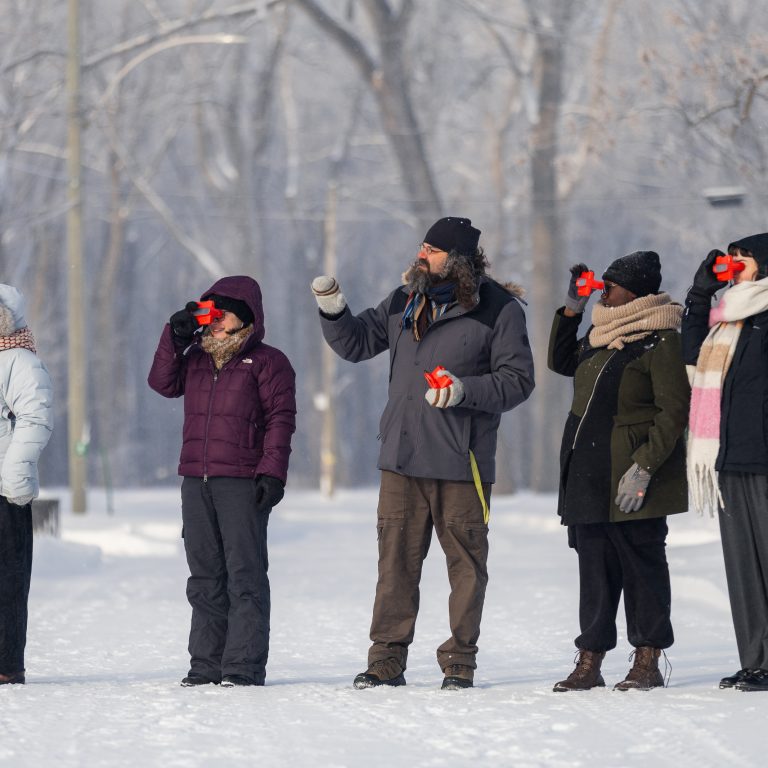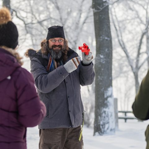 Comme le chantait Félix Leclerc : « Pour supporter le difficile et l’inutile, y a l’tour de l’île. » Il parlait dans son cas de l’île d’Orléans, mais notre île Saint-Quentin a tout autant à offrir. Avant Récits de berges, il y a eu d’abord le Tour de l’île qui a été offert pendant trois ans à l’île Saint-Quentin. À ce moment, le musée Boréalis avait dû fermer le temps de renouveler leur exposition permanente. L’équipe souhaitait tout de même maintenir une certaine programmation et l’idée de créer une activité extérieure durant l’hiver donnait tout son sens au mot vitalité.