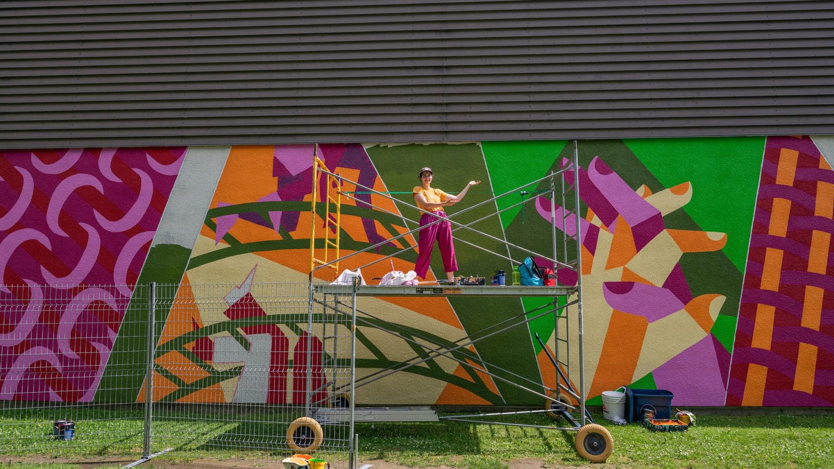 Accompagner l’artiste muralistes Julian Palma dans la réalisation de Rivière aura permis à Andrée Godin de se familiariser avec la création de murales. © Étienne Boisvert